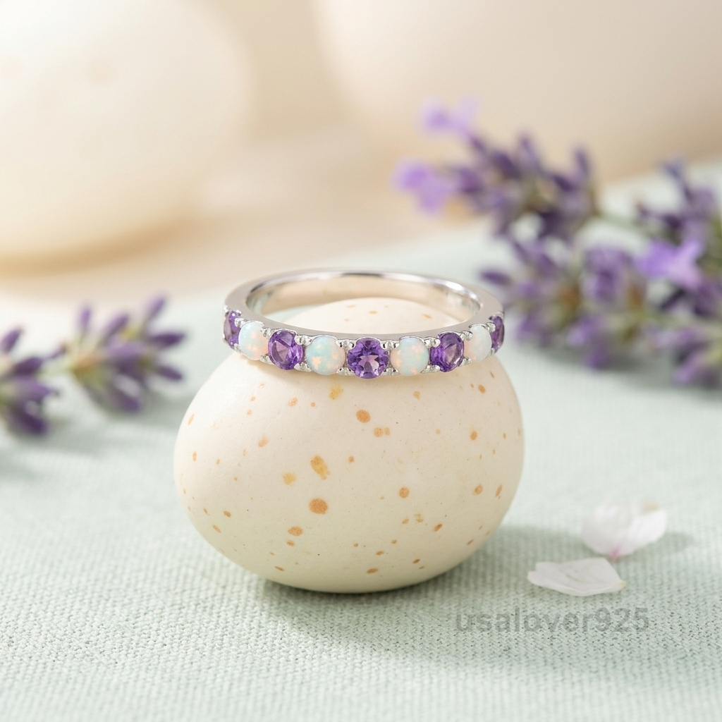 Discover a mesmerizing symphony of color with this Amethyst and Opal Eternity Band. Meticulously crafted in high-polish 925 Sterling Silver, this ring features a continuous circle of alternating vibrant purple amethysts and iridescent opals that flash with hidden fire. Whether you are celebrating a February or October birthday, seeking a unique alternative wedding band, or building a celestial-inspired ring stack, this piece offers a sophisticated and magical touch to any jewelry collection.