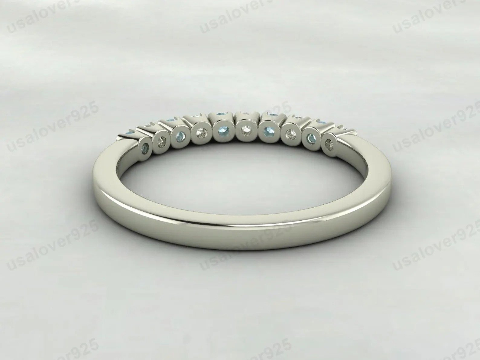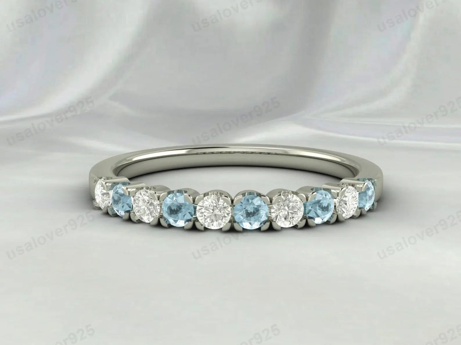 Aquamarine & CZ Diamond Stone Eternity Band for Women – 925 Sterling Silver Ring Jewelry