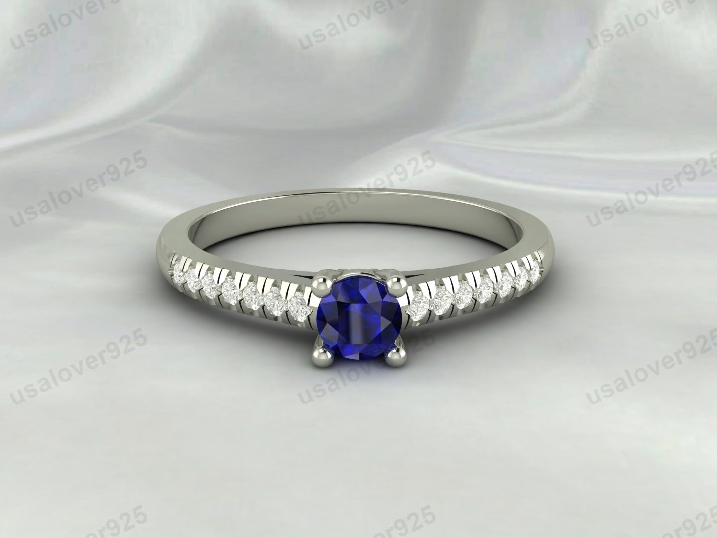 Blue Sapphire & CZ Diamond Gemstone Solitaire Women Ring – 925 Sterling Silver Jewelry