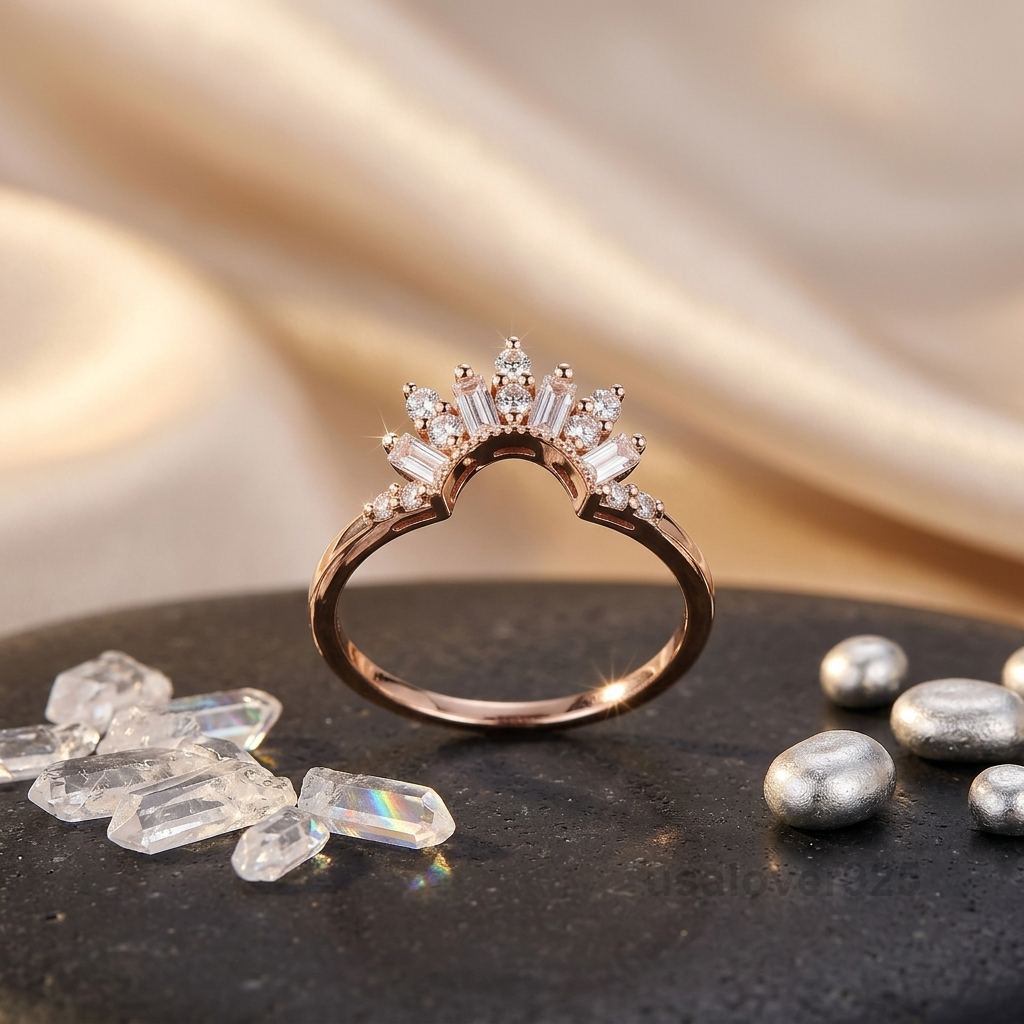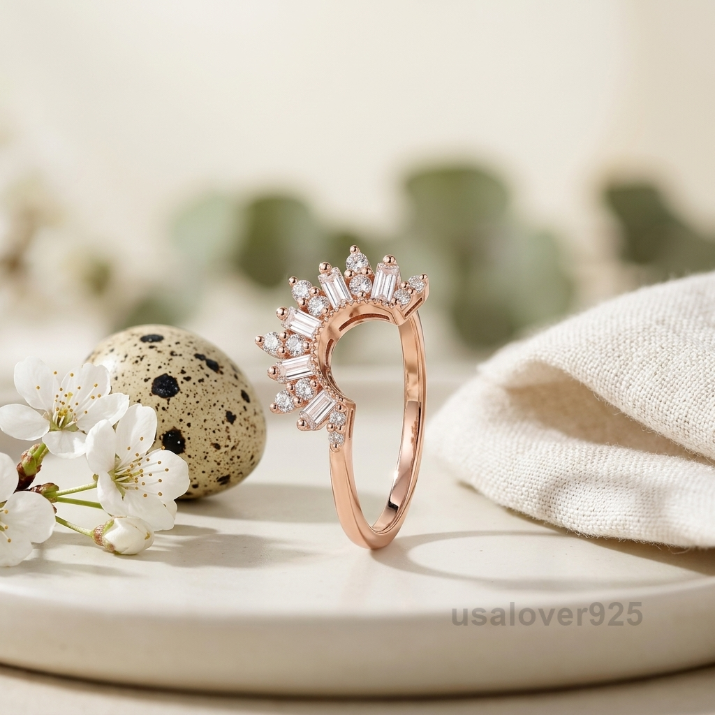 Elevate your ring stack with the sharp, sophisticated lines of this CZ Baguette Curved Half Eternity Band. Meticulously handcrafted in high-polish 925 Solid Sterling Silver, this ring features a stunning row of crisp, rectangular-cut Cubic Zirconia baguettes set in a graceful arch. The linear precision of the baguette cut creates a unique “hall of mirrors” effect that captures light with modern clarity. Designed to nestle perfectly against solitaire engagement rings or serve as a standalone minimalist statement, this band offers a timeless blend of Art Deco charm and contemporary brilliance.
