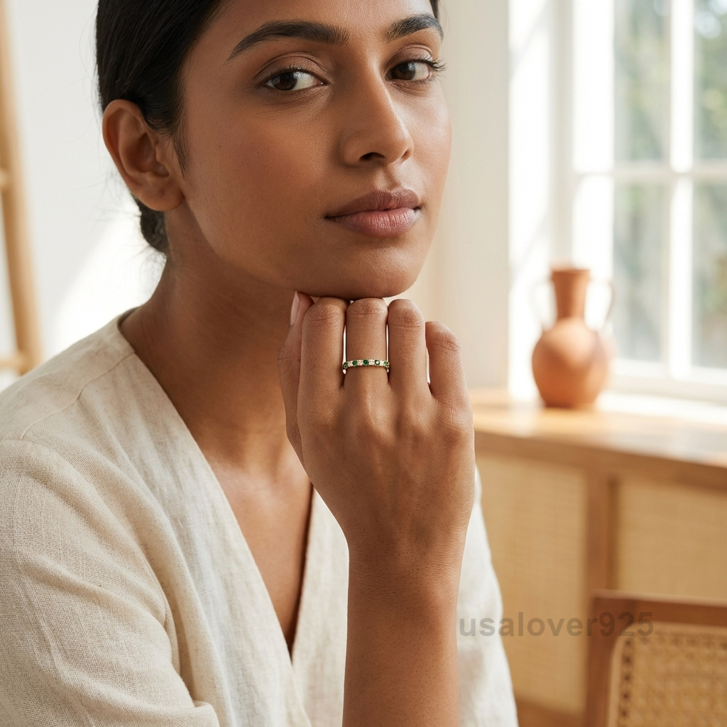 Illuminate your hand with the regal contrast of this Emerald and CZ Eternity Band. Meticulously handcrafted in 925 Solid Sterling Silver, this ring features a shimmering, continuous row of alternating brilliant-cut green Emeralds and sparkling Cubic Zirconia stones. The rich, verdant tones of the Emerald are perfectly highlighted by the diamond-like fire of the CZ accents. Whether chosen as a vibrant May birthstone gift, a unique alternative wedding band, or a sophisticated stacking piece, this ring offers a high-shine blend of royal charm and modern grace.