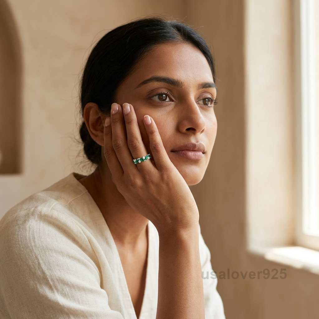 Make a majestic style statement with this Marquise Emerald and CZ Eternity Band. Meticulously handcrafted in 925 Solid Sterling Silver, this ring features a continuous circle of alternating marquise-cut green Emerald-toned stones and brilliant Cubic Zirconia. The unique “navette” shape of the stones allows them to catch light from every angle, creating a sophisticated and finger-flattering silhouette. Ideal as a vibrant May birthstone gift, a unique alternative wedding band, or a high-contrast stacking piece for your luxury jewelry collection.