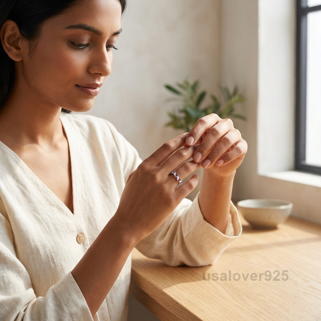 Illuminate your collection with the enchanting contrast of this Moonstone and Amethyst Gemstone Band. Meticulously handcrafted in 925 Solid Sterling Silver, this ring features a shimmering row of alternating translucent Moonstones and rich, royal-purple Amethysts. The mystical blue flash of the moonstone perfectly complements the regal tones of the amethyst, creating a piece that feels both celestial and grounded. Whether chosen as a unique multi-birthstone gift, a romantic anniversary band, or a mystical stacking piece, this ring offers a sophisticated blend of natural beauty and spiritual charm.