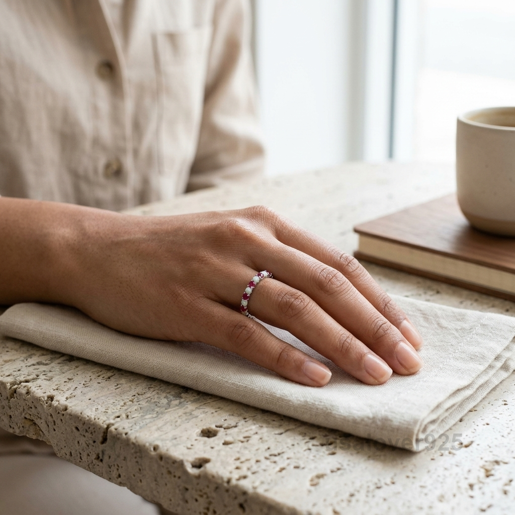 Illuminate your hand with the sophisticated contrast of this Opal and Ruby Half Eternity Band. Meticulously handcrafted in 925 Solid Sterling Silver, this ring features a shimmering row of alternating brilliant-cut crimson Rubies and iridescent White Opals. The rich, deep red tones of the Ruby perfectly highlight the mystical, multi-colored “fire” found within each Opal. Whether chosen as a meaningful multi-birthstone gift, a unique “something red” wedding band, or a high-shine stacking piece, this ring offers a timeless blend of royal charm and Jaipur craftsmanship.