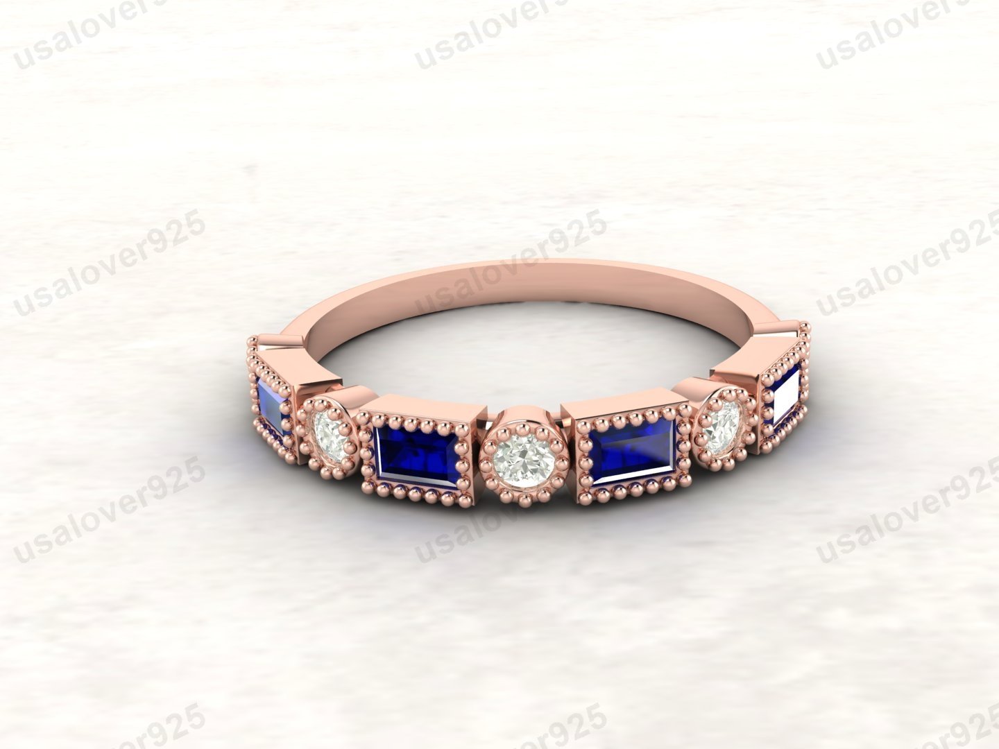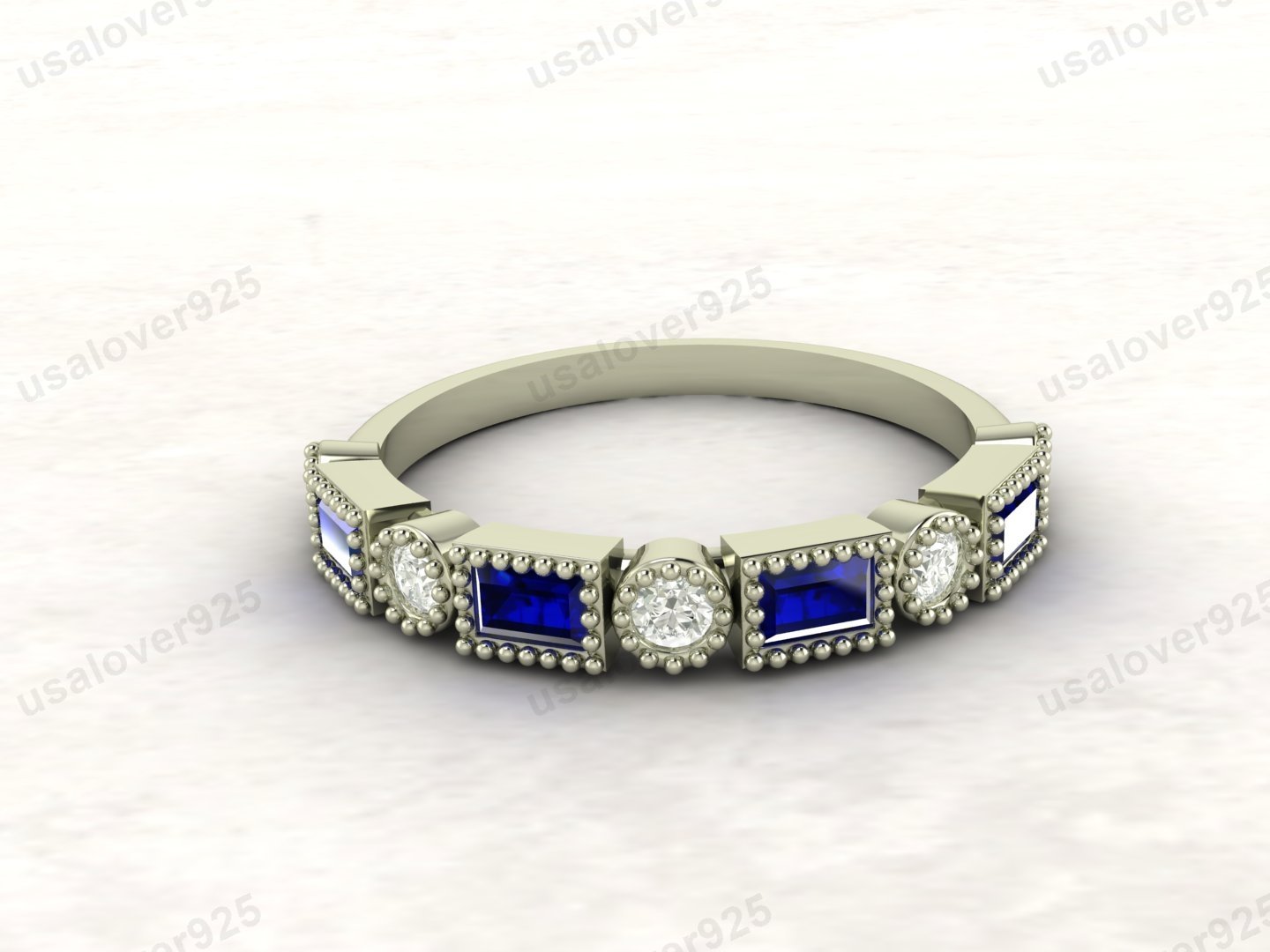 Sapphire & CZ Diamond Stone Half Eternity Women Band – 925 Sterling Silver Ring Jewelry