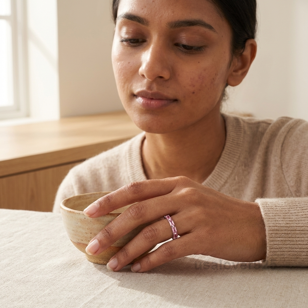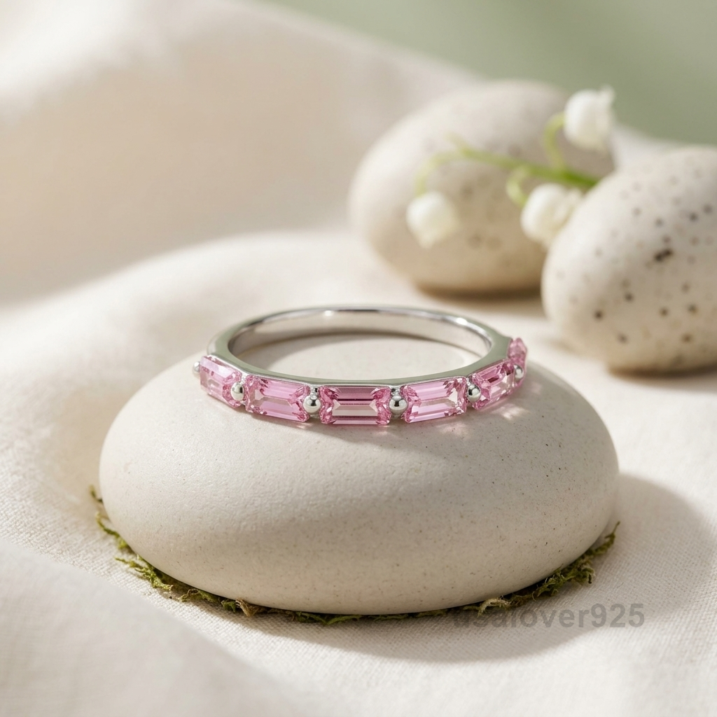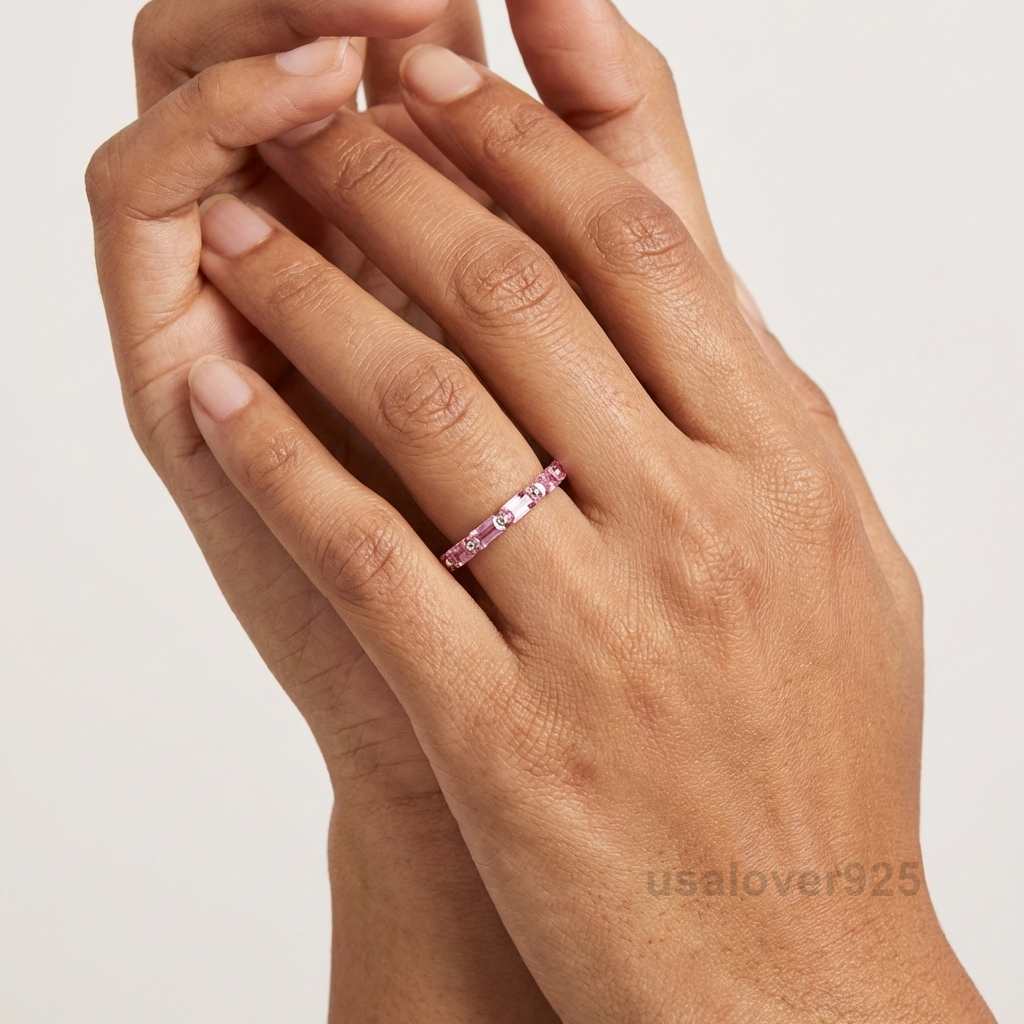 Step into a world of contemporary elegance with this Pink Tourmaline Baguette Eternity Band. Meticulously handcrafted in high-polish 925 Solid Sterling Silver, this ring features a continuous, shimmering row of crisp, rectangular-cut Pink Tourmalines. The linear precision of the baguette cut creates a unique, mirror-like “hall of mirrors” effect that perfectly showcases the stone’s vibrant rosy hues. Whether chosen as a meaningful October birthstone gift, a modern alternative wedding band, or a striking stacking piece, this ring offers a timeless blend of architectural style and feminine grace.